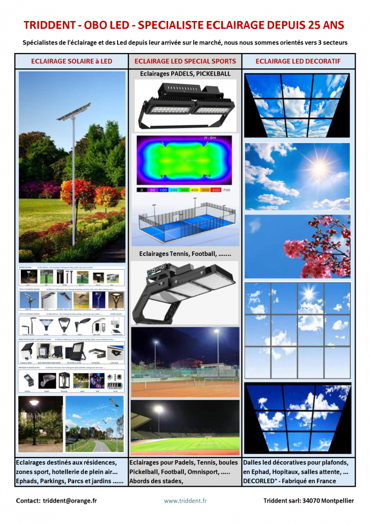 Depuis 25 ans TRIDDENT SARL spécialiste de l’éclairage recherche, sélectionne et distribue des éclairages professionnels, sous les marques OBO Led Light et Décorled. Notre politique: La qualité sans compromis aux bas prix, la durabilité, la réparabilité et la capacité a fournir des éclairages suivis dans le temps, sans blabla et fausses informations de provenance (exemple assemblage en France vendu pour du fabriqué France), pas de site racoleur mais juste la présentation simple et réelle des articles proposés au juste prix.